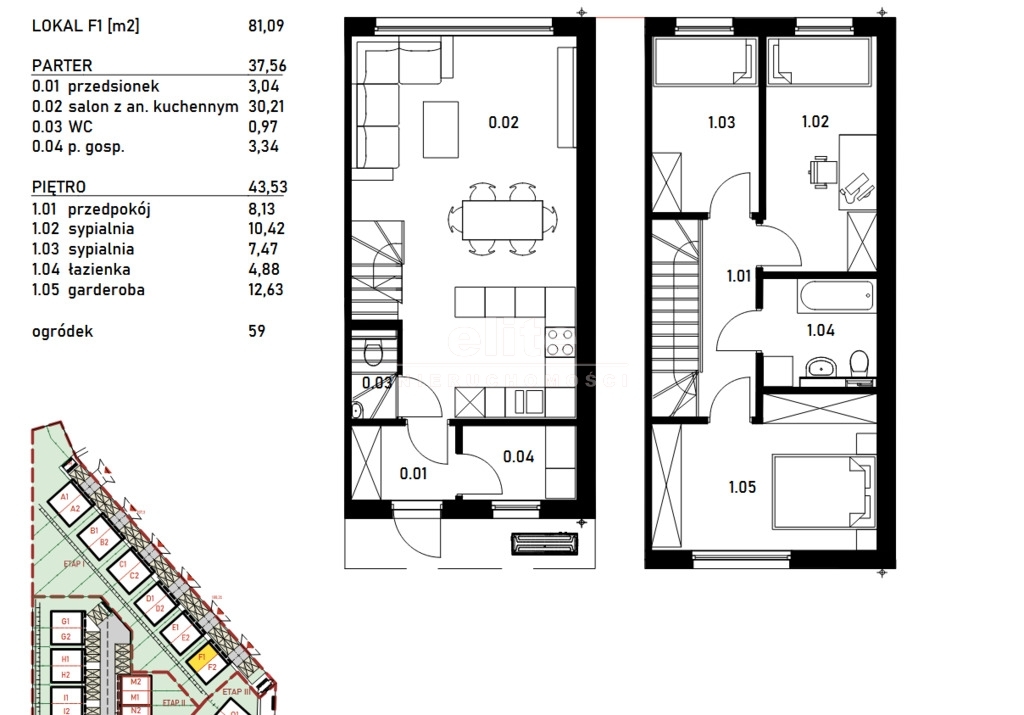 Na parterze znajduje się przedsionek (3,04m2), pomieszczenie gospodarcze (3,34m2), oddzielne WC (0,97m2), oraz przestronna strefa dzienna, na którą składa się salon z aneksem kuchennym (30,21m2) i wyjściem do ogródka (59m2). Na piętrze natomiast mamy duży przedpokój (8,13m2), trzy sypialnie o wymiarach - 10,42m2, 7,47m2 i 12,63m3, oraz łazienkę (4,88m2).