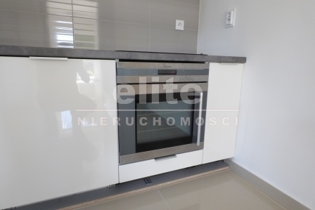 W kuchni – meble MDF wysoki połysk w zabudowie z pełnym wyposażeniem AGD.