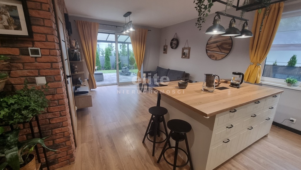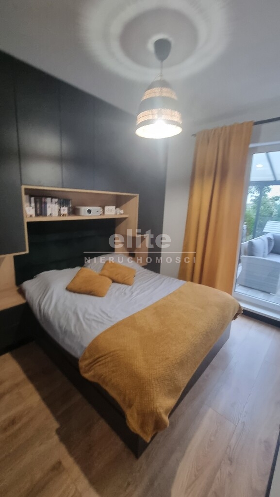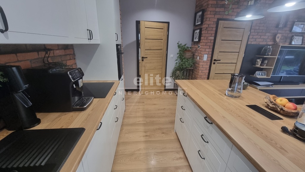 Meble wykonane na wymiar gwarantują funkcjonalność i estetykę. Nowoczesna kuchnia została w pełni wyposażona – znajduje się tu wyspa, lodówka, piekarnik oraz zmywarka. Stylowa łazienka oferuje prysznic typu walk-in oraz praktyczną zabudowę pod pralkę i suszarkę.