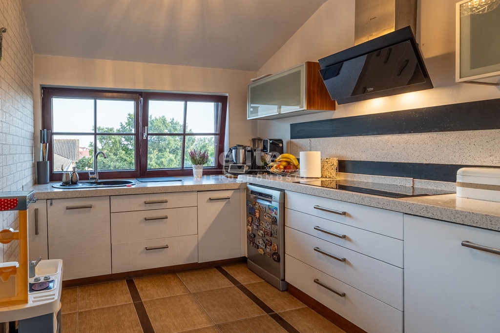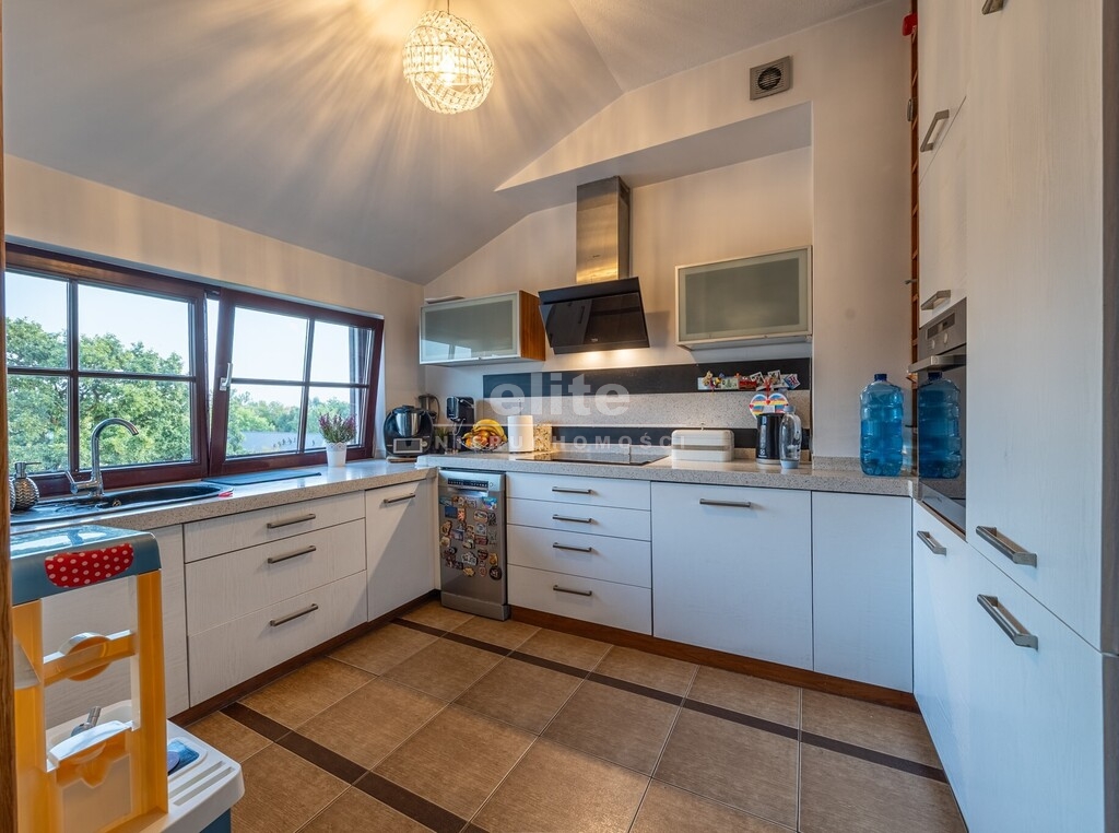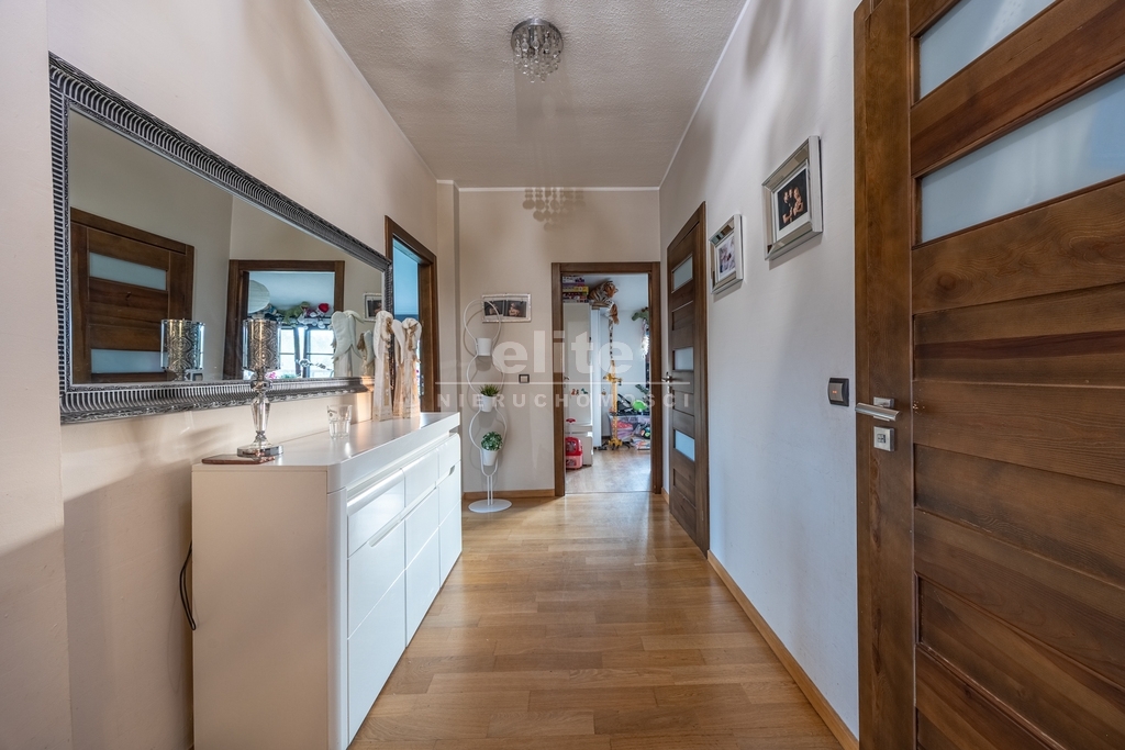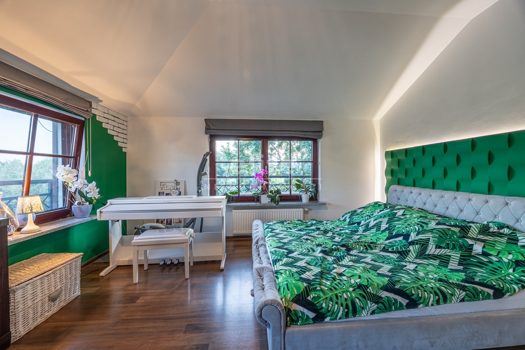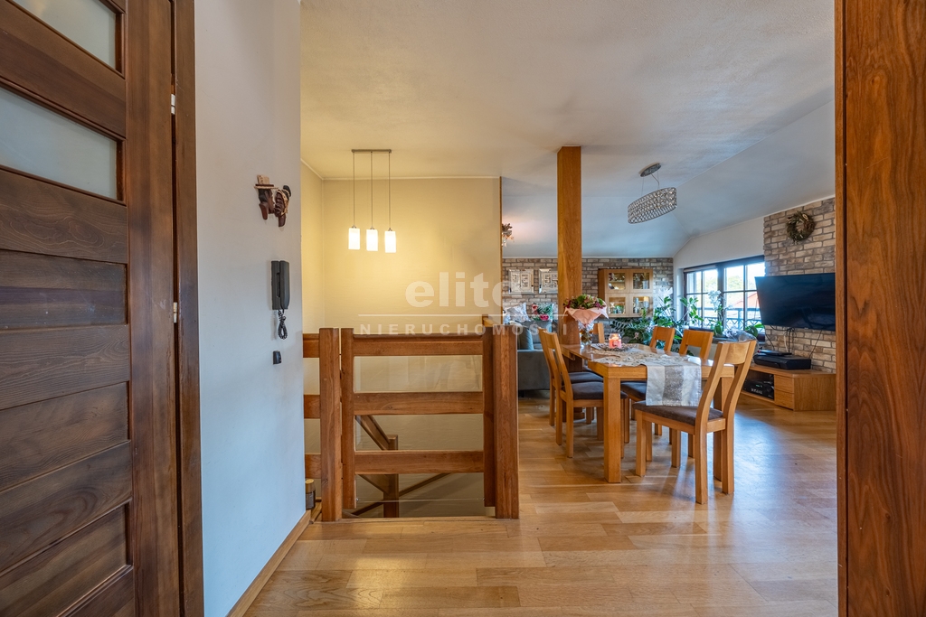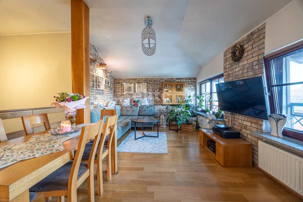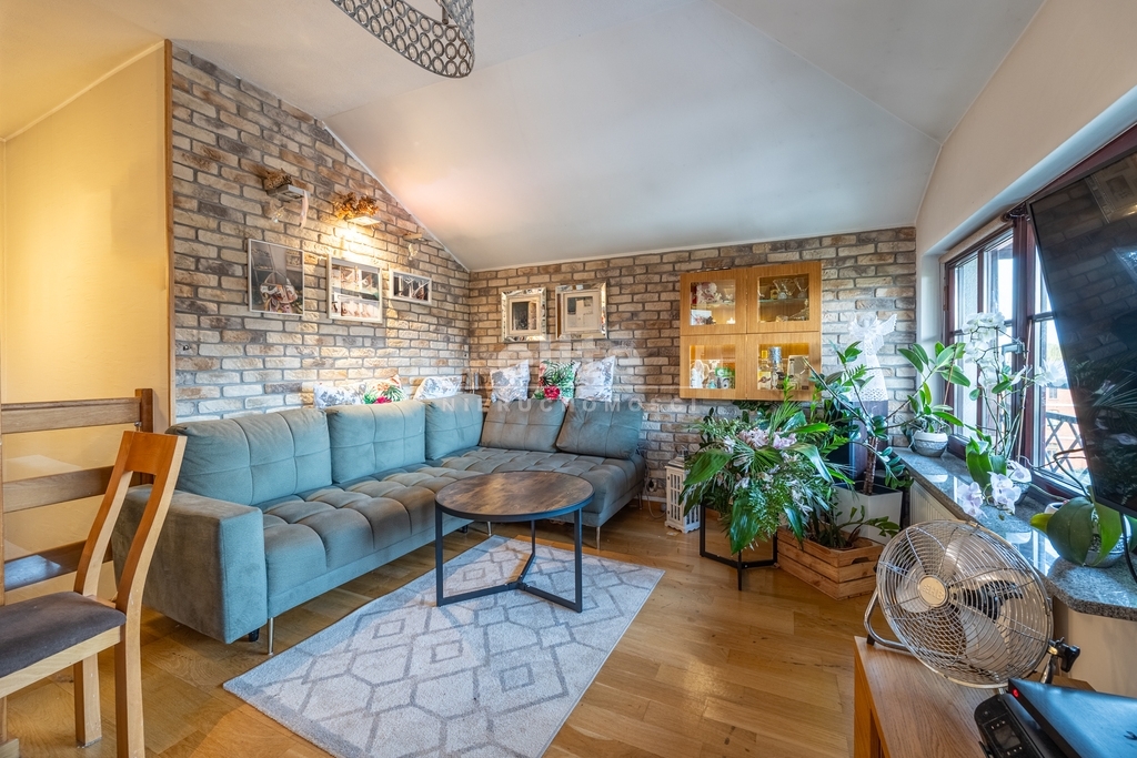 Na pierwszym poziomie znajduje się przedpokój z którego dębowe schody prowadzą na część mieszkalną. Mieszkanie charakteryzuje się wysoką jakością wykończenia – podłogi i drzwi są wykonane z drewna, co dodaje wnętrzu ciepła i elegancji. Nowoczesna łazienka wyposażona jest w kabinę prysznicową i ogrzewanie podłogowe, zapewniając komfort nawet w chłodne dni. Okna wychodzące na południe i zachód gwarantują doskonałe doświetlenie wnętrza przez cały dzień.
