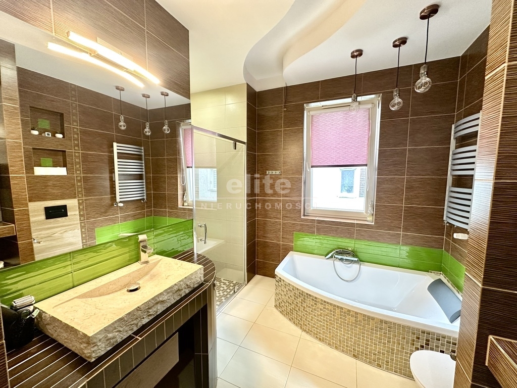 - Łazienka z oknem– przestronna i komfortowa, z ogrzewaniem podłogowym. Wyposażona w dużą kabinę prysznicową oraz wannę – dzięki temu można cieszyć się zarówno szybkim prysznicem, jak i długą, relaksującą kąpielą.