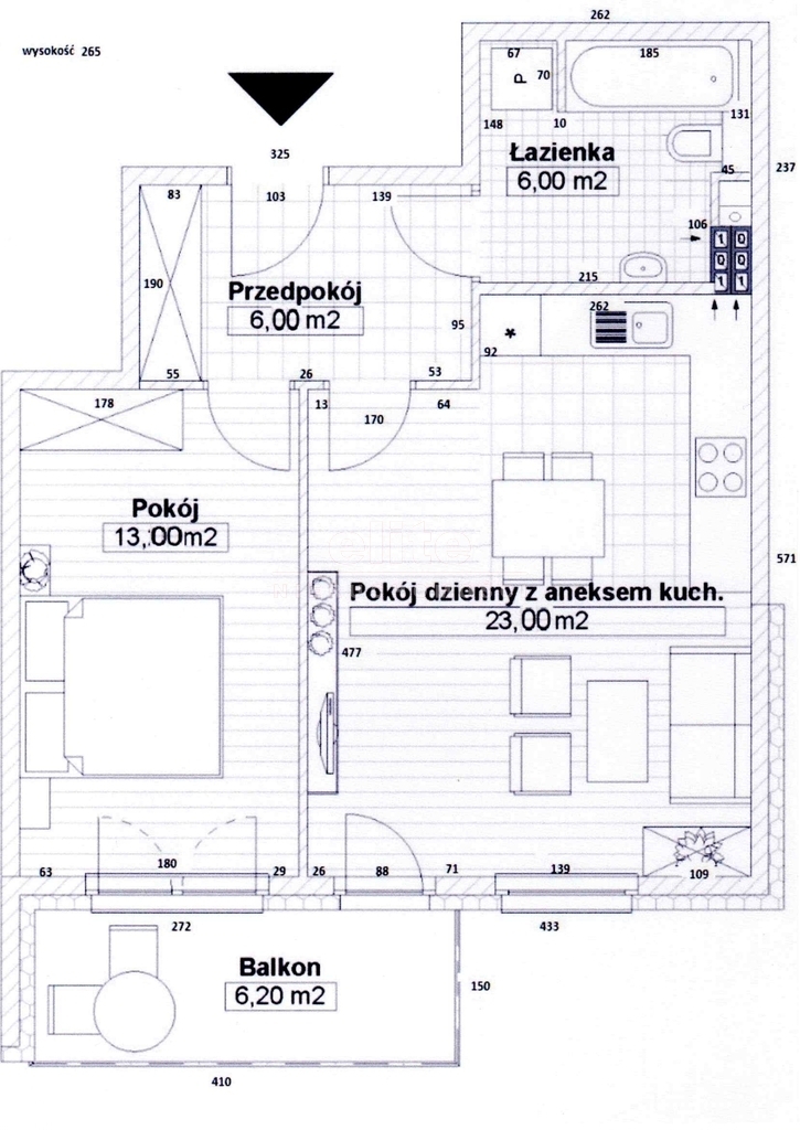 Układ: salon z aneksem + sypialnia + łazienka + przedpokój
